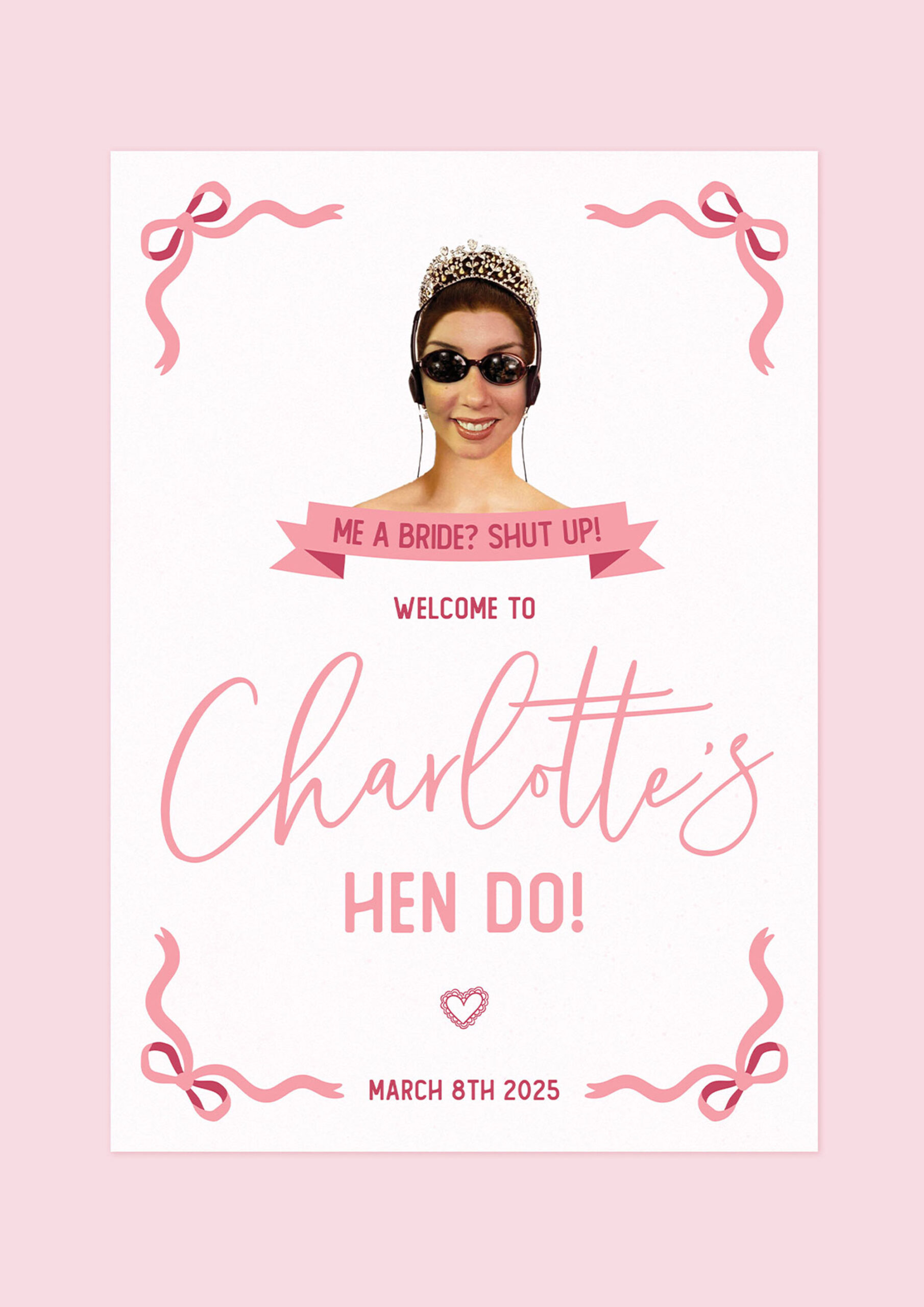 ‘ME A BRIDE? SHUT UP!’ Charlotte’s hen do stationery was a playful, ‘Princess Diaries’ themed design project inspired by the movie, bringing a nostalgic and lighthearted concept to life. The aim was to create a set of graphics that felt instantly recognisable, whilst adding a personalised twist for the bride-to-be.
